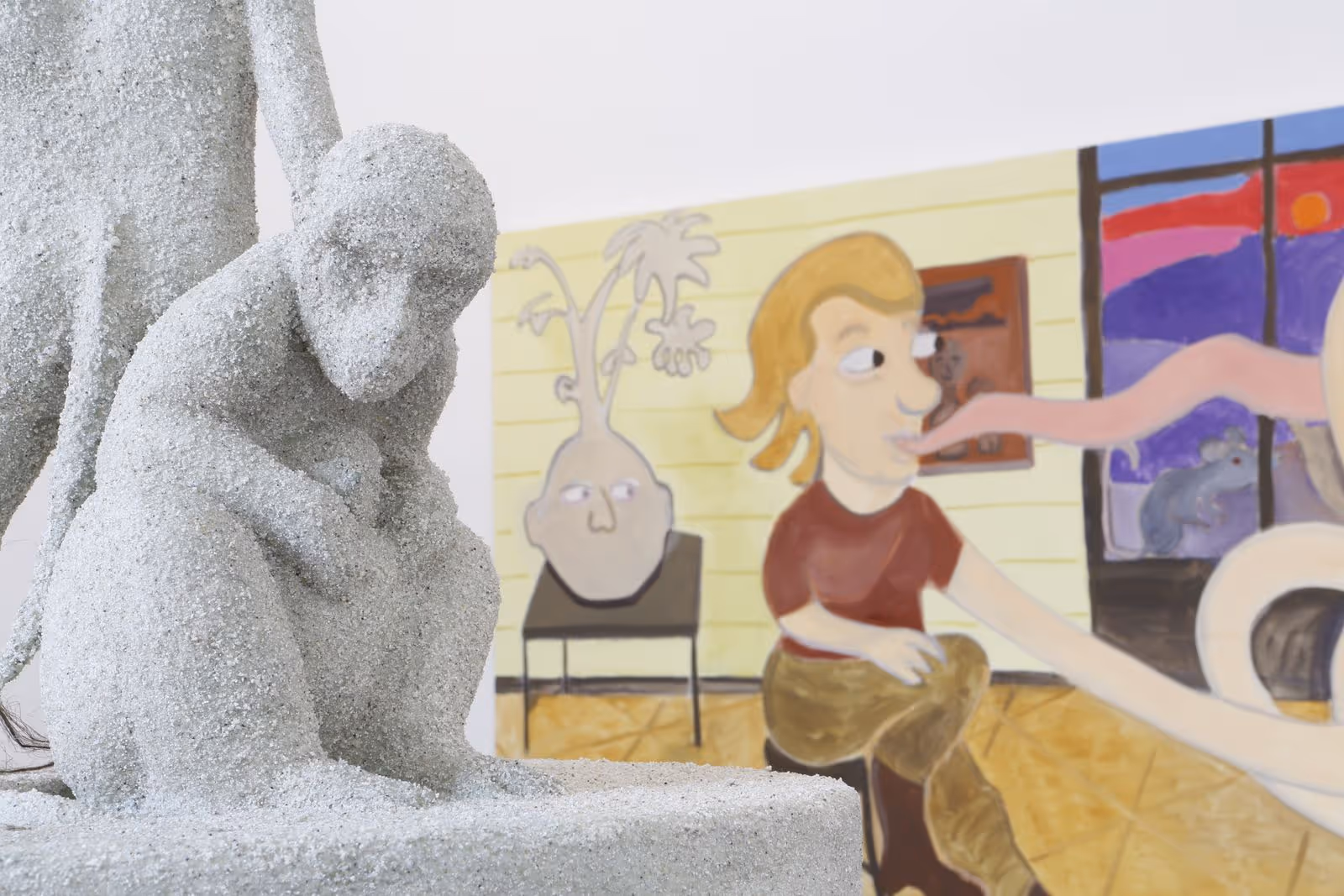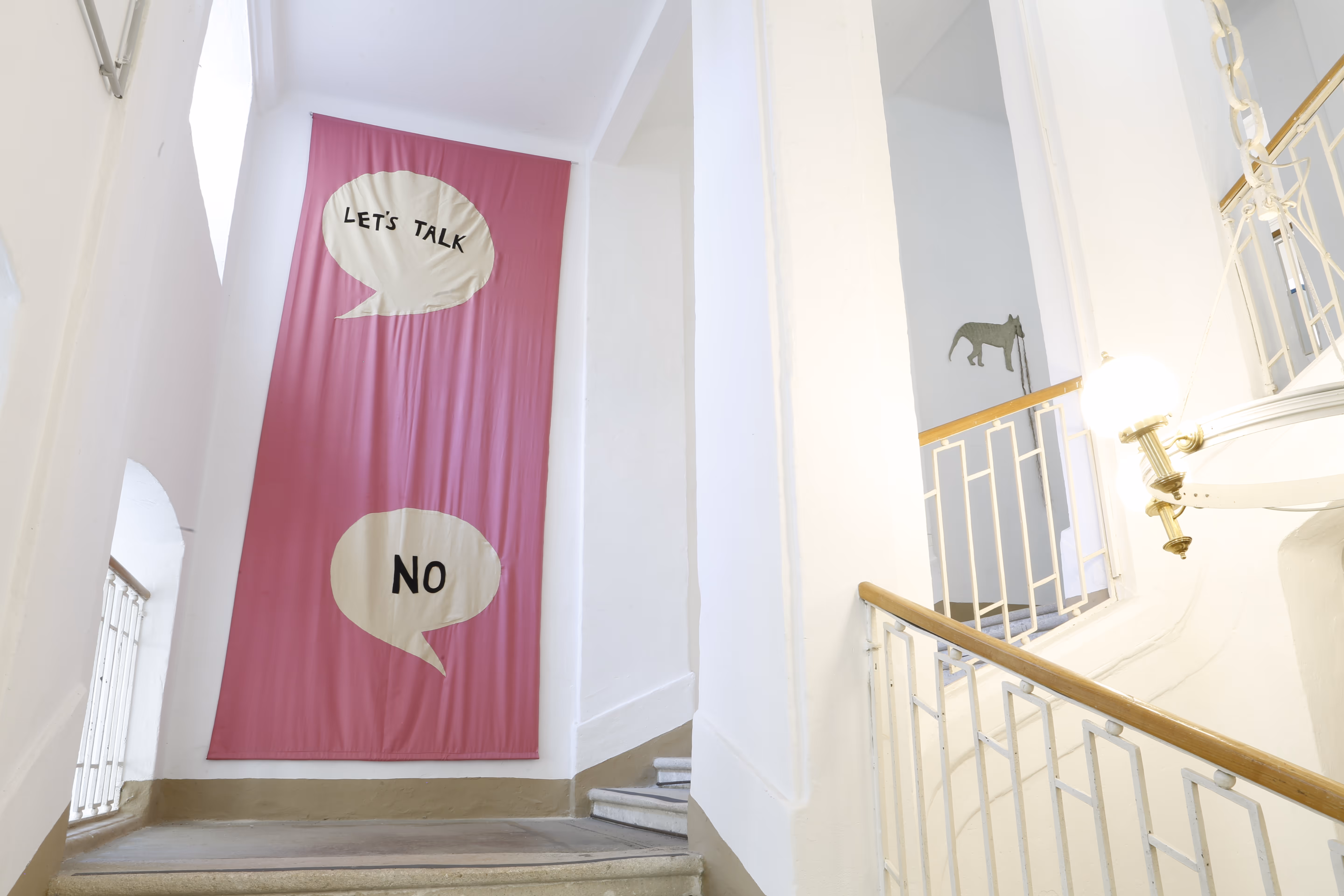 Entlang einer haarigen Linie verflechten die Künstlerinnen humaneund animalische Körper mit unterschiedlichen Zeitlichkeiten. Wir müssen reden, Let’stalk, steht da auf einer rosaroten Fahne in Comic-hafterSprechblasen-Manier. Die Dinge geraten endlich utopisch.