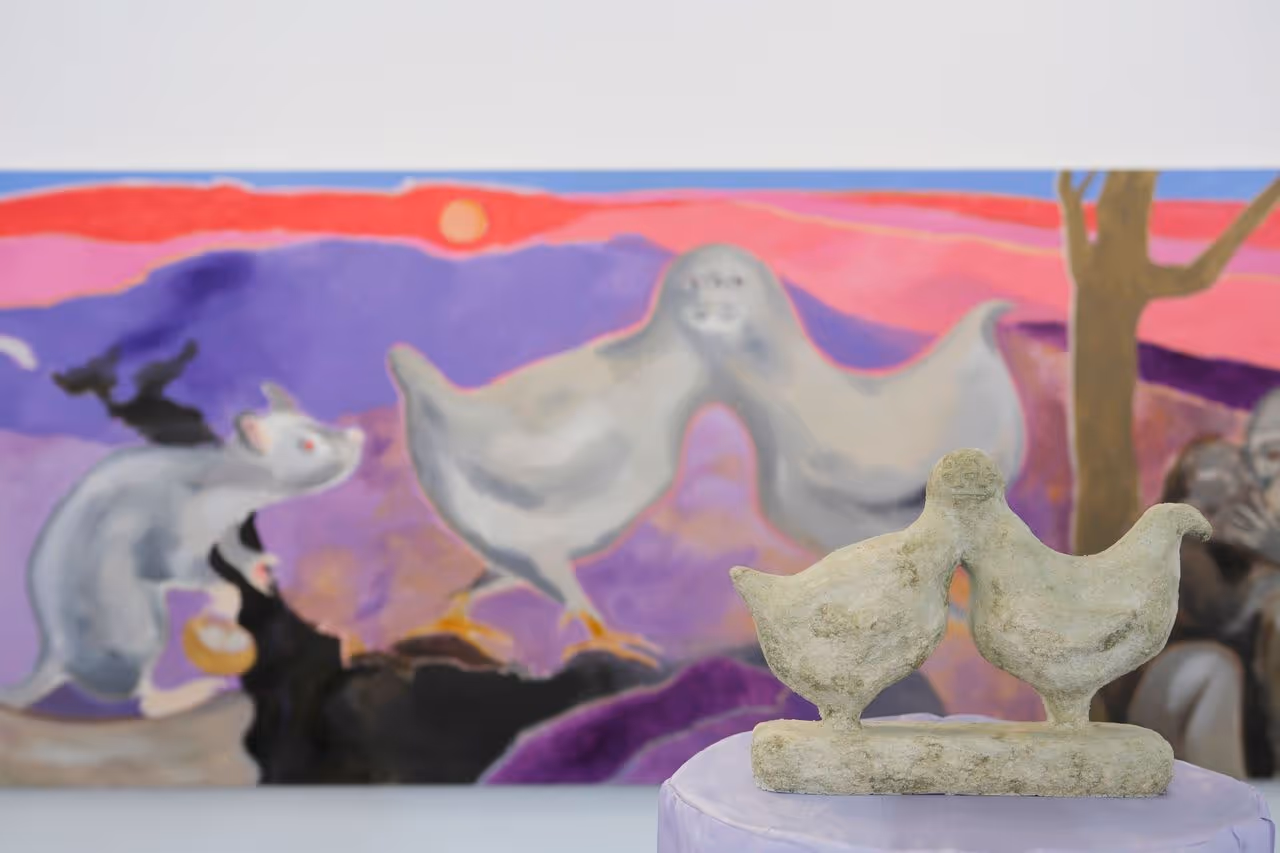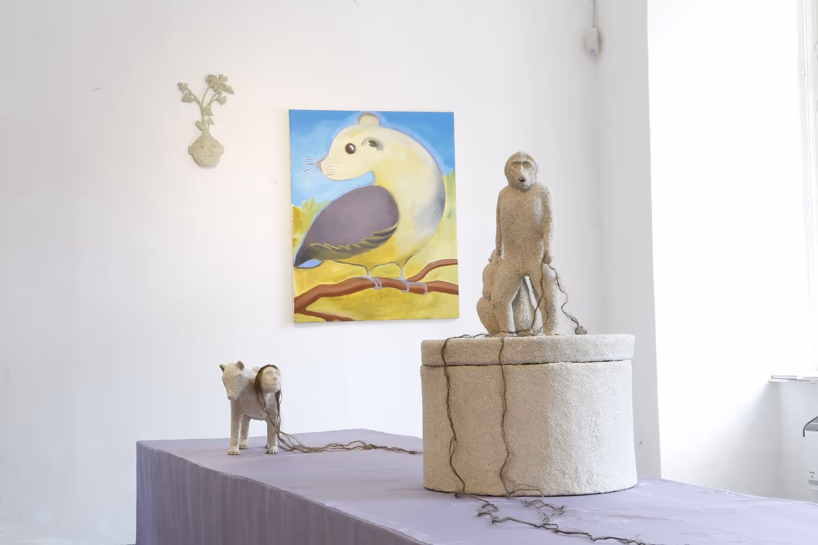 Dabei entwickeln die Künstlerinnen eine „Praxis des Lernens“, diees ihnen ermöglicht, einander quer durch Genres, Medien und Materialien zuspiegeln. Gemeinsam entsteht ein mythologisch inspiriertes, archaisches Tier-und Pflanzenuniversum, dessen kombinatorische Möglichkeiten ans Unendlichegrenzen. Gemalte Geschöpfe positionieren sich dabei vor kitschigen Sonnenaufgängen.Mit einem Körbchen voller Eier in der Pfote lugt eine Ratte zu siamesischendreiäugigen Hühnerzwillingen hinauf. Rechts davor, ebenfalls in Grau gemalt,kauern vor einem Baum, eng beieinander zwei Affen. Eine andere Leinwand ziertein einziges monsterhaftes Auge, das zu weinen scheint. Humpty Dumpty ist vonder Mauer geklettert und erscheint tänzelnd in der Konditorei Aida. Einherzförmiges Wesen wurzelt tief unter der Erde. Um dieses phantastische Bestiariumzu erweitern, tauchen antike Mischwesen als erstarrte graue Götzenfiguren auf mit lila Seide überzogenen Podesten auf. Ein zarter humanoider Affe reitet auf einem hundeähnlichenMacaca mulatta (Rhesusaffe), während der Pappmaché-Wölfin mit dem menschlichenGesicht die säugenden Kinder abhandengekommen sind. Seltsam wächst zudem ausKöpfen mit Ohren und Augen wildwucherndes Gestrüpp. Die aus Wasser, Papier und Kleisterhergestellten Skulpturen sind eine Kombination von Elementen, die realenGeschöpfen entnommen sind. Die fast unmerkliche Überschreitung des Realen, dieObsession der Verdopplung, die Wandlung in imaginäre Wesen, die von denKünstlerinnen gezeigt werden, spiegeln die innere Welt menschlicher Phantasien,Träume und Ängste. Sie sind höchst originell erdacht und stellen ein Pasticheaus Quellen, Stilen, literarischen Genres, Kulturen, mythologischen Geschichtendar. Es macht Spaß, sie anzuschauen, aber sie sind gleichzeitig erschreckendbefremdlich.