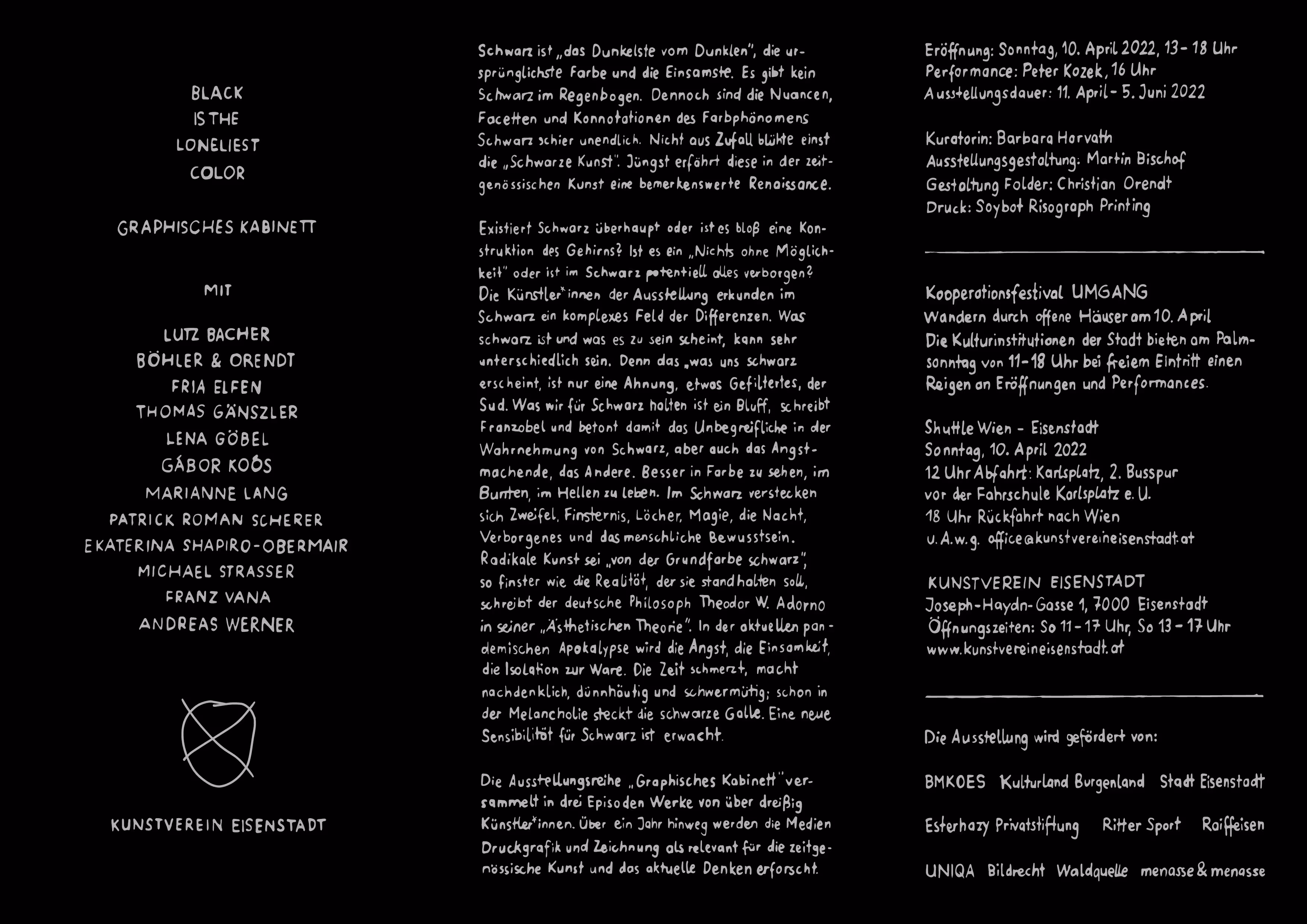 Schwarz ist „das Dunkelste vom Dunklen“; die ursprünglichste Farbe und die Einsamste. Es gibt kein Schwarz im Regenbogen. Dennoch sind die Nuancen, Facetten und Konnotationen des Farbphänomens Schwarz schier unendlich. Nicht aus Zufall blühte einst die „Schwarze Kunst“. Jüngst erfährt diese in der zeitgenössischen Kunst eine bemerkenswerte Renaissance.