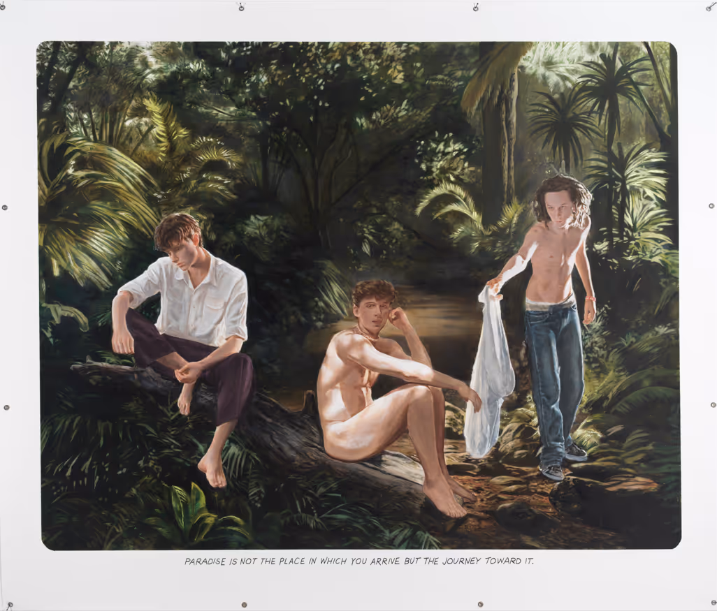 Esterházy’s Schlosspark, famous for its orangery, was once celebrated for its collection of exotic plants—a lush, flourishing world reminiscent of the scenes in Muntean/Rosenblum’s paintings. Yet in their work Paradise is not the Place, this nature becomes mere décor—an Instagram-ready backdrop for a staged wellness experience. It functions as a setting in which one projects calm and serenity.
