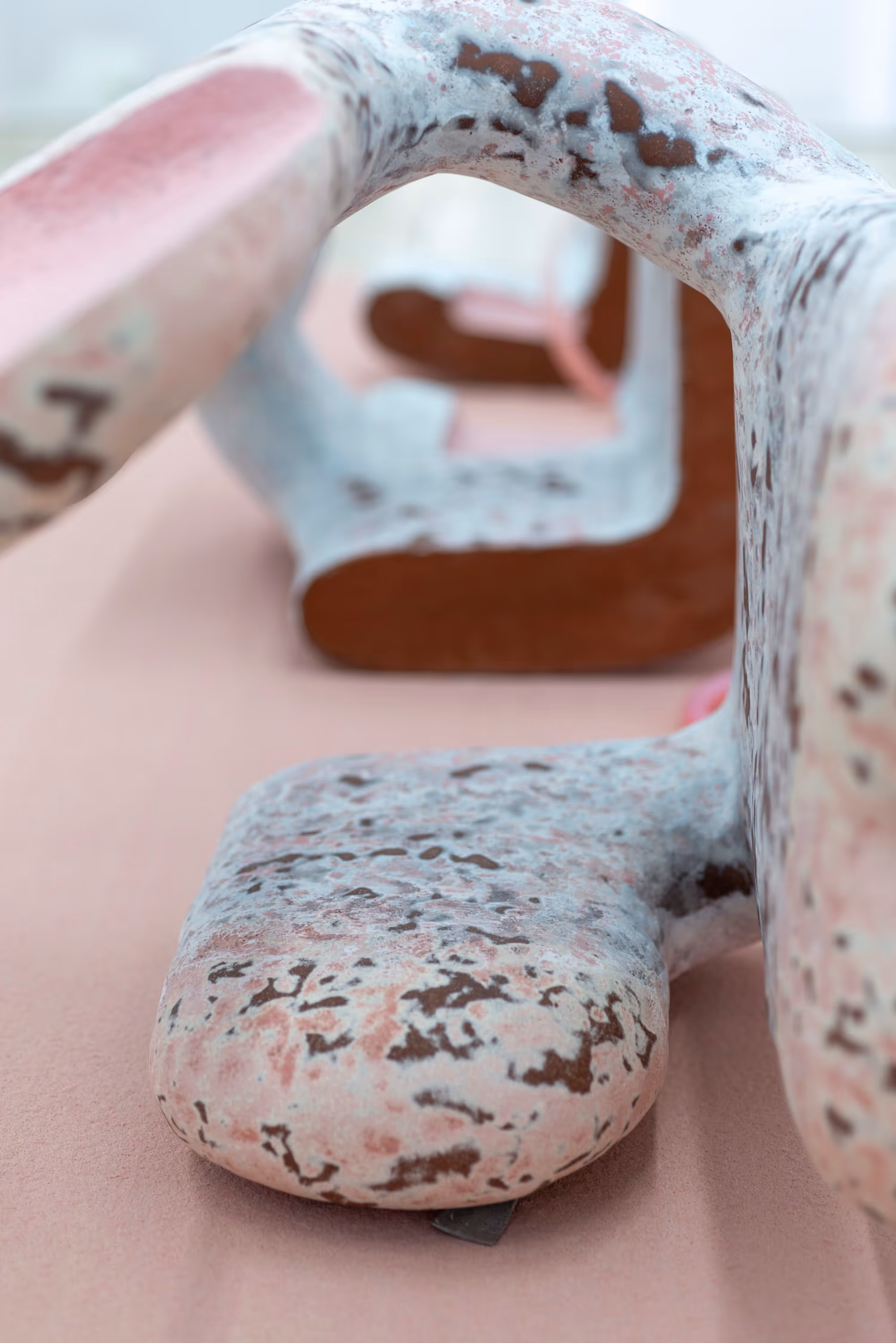 Beate Gatschelhofer studies “Sculpture and Transmedial Space” as well as “Plastic Design/Ceramics” at the University of Art and Industrial Design in Linz. Her works on display at the Bildhauerhaus fill the space in the booths of the Bildhauerhaus completely. They lie quietly on a pink carpet. At first glance, one pauses, as it seems that huge pink and white fragments of a sugary bakery have invaded the house. Only upon closer inspection does one realize that these are rigid objects with rough, porous surfaces. They engage in dialogue with themselves, the viewer, and the minimalist cubicles in the Sculpture House.