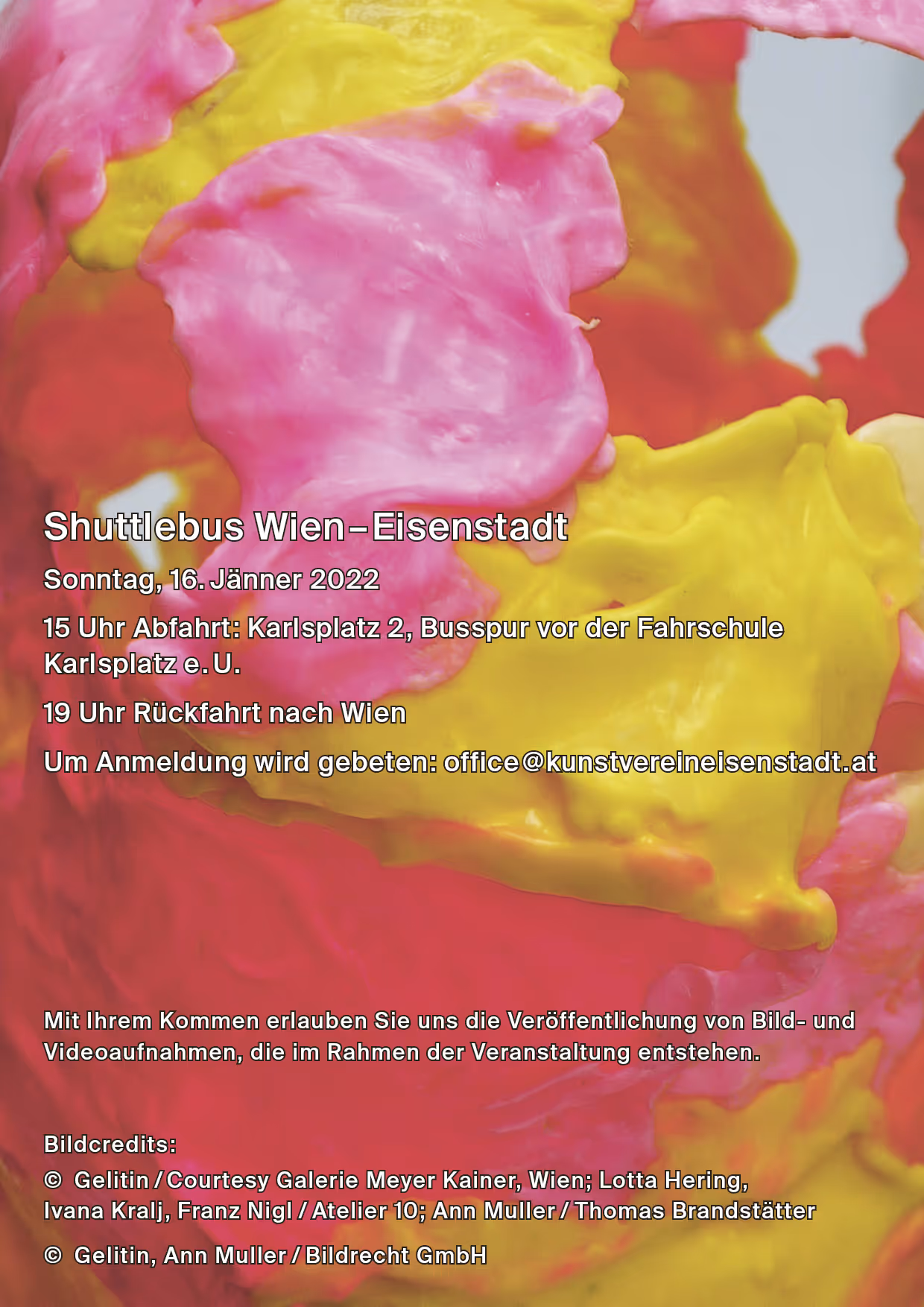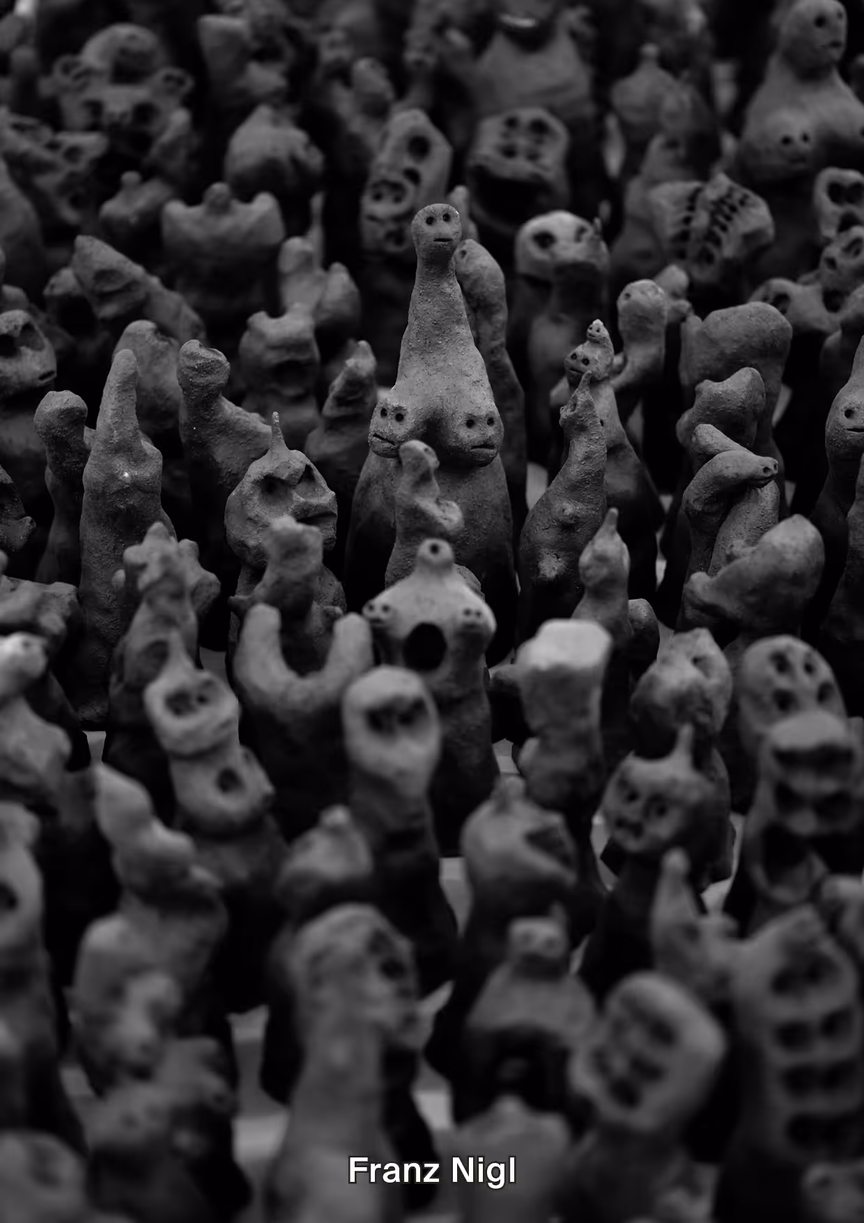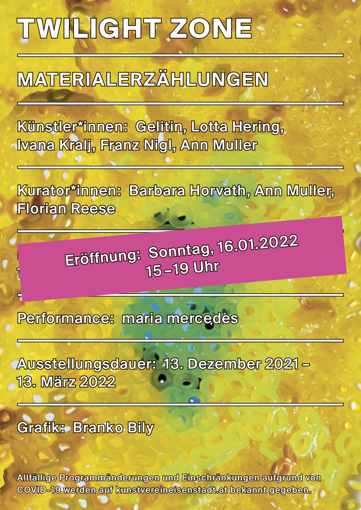 Gezeigt werden üppige Vorhänge und eine gewaltige Spielfigur von Ann Muller gefolgt von einer Sandlinie gespickt mit „zwielichtigen“ Perlen und etwas außerhalb in Vitrinen verstaute intime (Körper)teile von Ivana Kralj und den lichten Streifen von Lotta Hering, belagert von unzähligen archaisch-geisterhaften Gestalten des Franz Nigl, bestenfalls verteidigt von Gelitins rekombinierten Lebensformen konserviert in Reagenzgläsern und getragen von einer Tischplatte aus rekombinierten Möbelteilen eingegossen in Synthetik-Aspik, partiell beleuchtet von einem Kokon aus Thermoplast.
