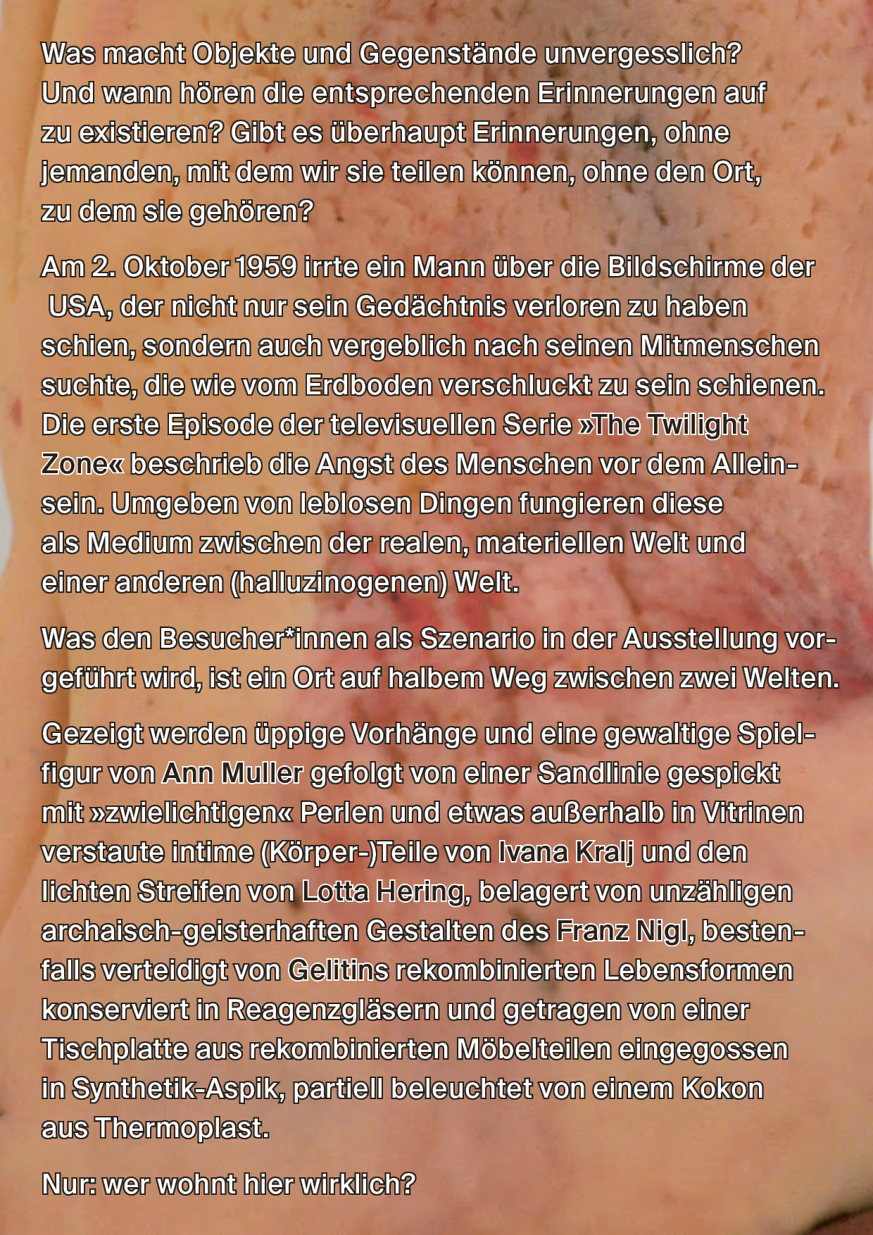 Am 2. Oktober 1959 irrte ein Mannüber die Bildschirme der USA, der nicht nur sein Gedächtnis verloren zu haben schien, sondern auch vergeblich nach seinen Mitmenschen suchte, die wie vom Erdboden verschluckt zu sein schienen. Die erste Episode der televisuellen Serie„The Twilight Zone“ beschrieb die Angst des Menschen vor dem Alleinsein. Umgeben von leblosen Dingen fungieren diese als Medium zwischen der realen, materiellen Welt und einer anderen (halluzinogenen) Welt.